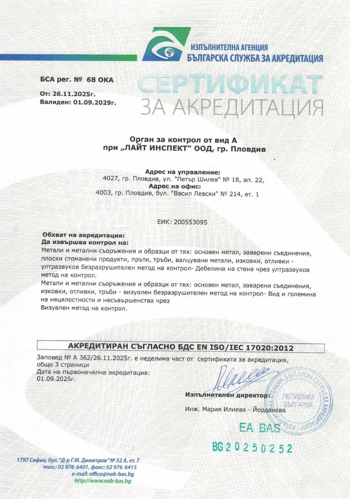 Фирма „Лайт Инспект“ ООД – гр. Пловдив е ОРГАН ЗА КОНТРОЛ ОТ ВИДА „A“ –